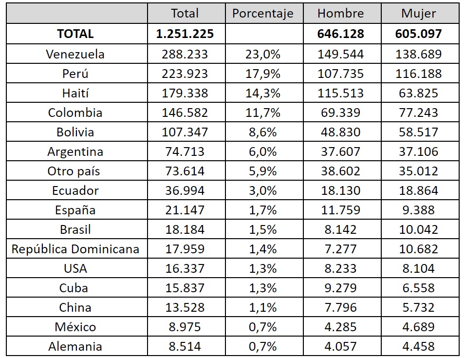 En tercer lugar, en tanto, corresponde a los ciudadanos procedentes de Haití, integrada por 179.338 personas (14,3%), seguida por los 146.582 colombianos en territorio nacional (11,7%) y las 107.347 personas provenientes de Bolivia (8,6%).