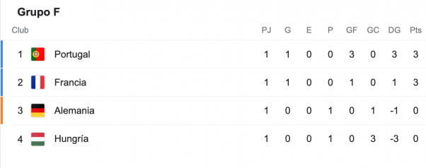 De esta manera, Francia se mantiene en el segundo lugar del grupo F, luego de que Portugal venciera por 3 a 0 a Hungría con 2 goles de Cristiano Ronaldo.