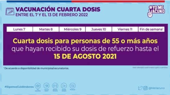 De acuerdo con el calendario estipulado desde el Ministerio de Salud (Minsal), a partir de este lunes 7 al 13 de febrero, recibirán la cuarta dosis de vacunación lo adultos de 55 o más años que hayan sido vacunados con la dosis de refuerzo o tercera dosis hasta el 15 de agosto de 2021.